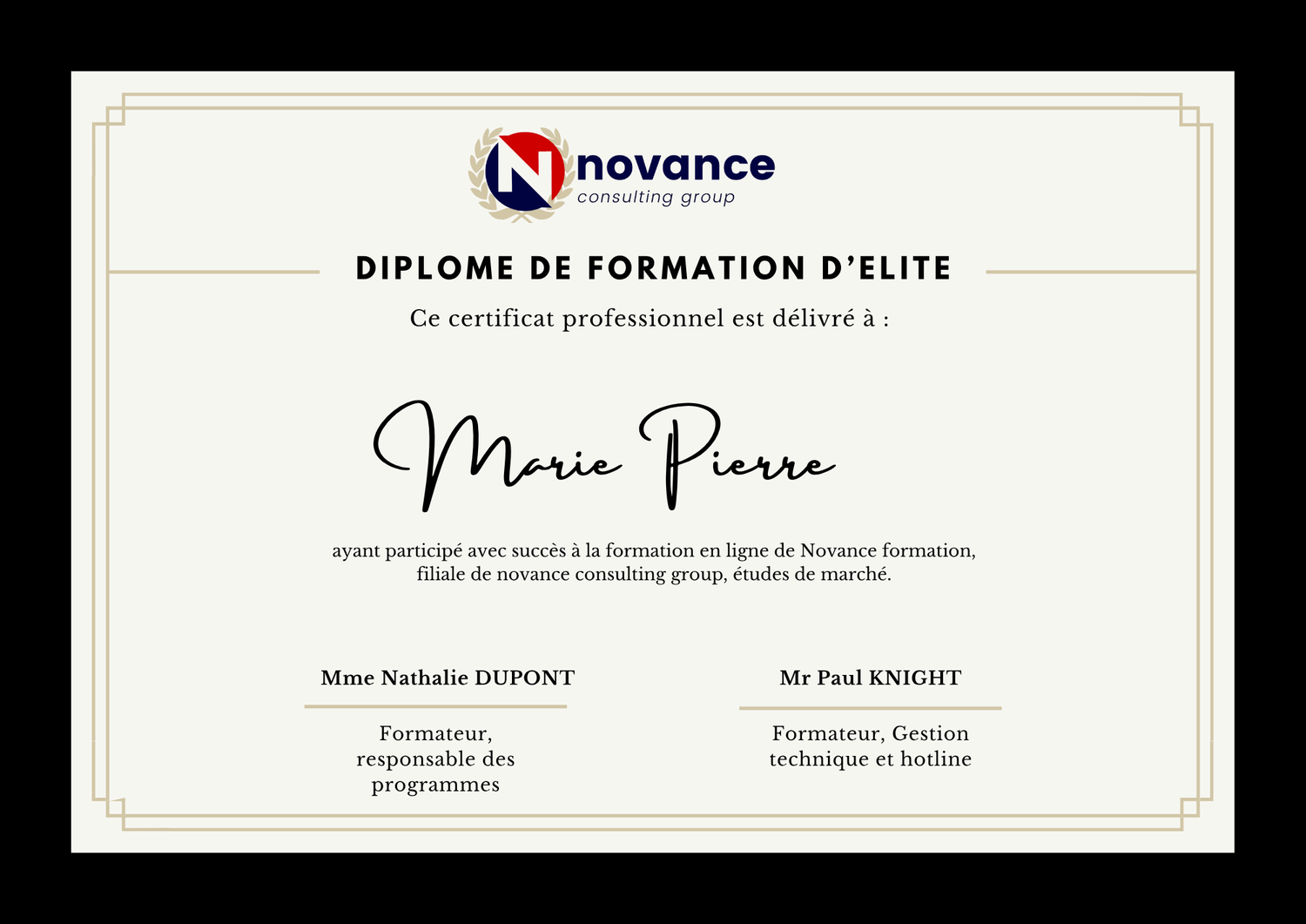 Un certificat de formation délivré par Novance Formation vous permet de rajouter une ligne à votre curriculum vitae attestant de la qualité de nos modules et la valeur de vos acquis.